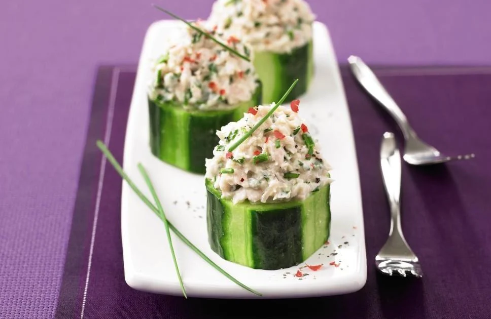 Creusez des rondelles de concombre et garnissez-les d’un mélange thon‑fromage frais‑citron. Fraîches, sans cuisson, prêtes en 15 min.