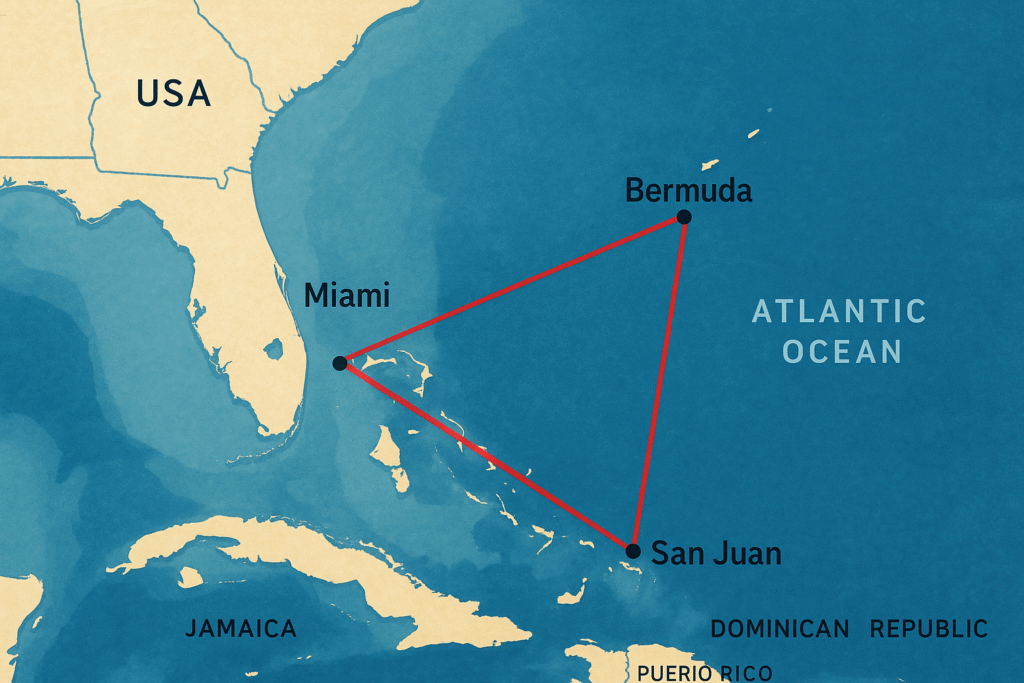 Le Triangle des Bermudes, zone triangulaire de l’océan Atlantique délimitée par Miami, les Bermudes et Porto Rico, est depuis le milieu du XXᵉ siècle au cœur de récits de disparitions inexpliquées de navires et d’avions, alimentant nombre de théories et de légendes. Si certaines hypothèses évoquent des anomalies magnétiques, des bulles de méthane ou des conditions météorologiques extrêmes, les études scientifiques et les enquêtes récentes privilégient aujourd’hui des explications plus prosaïques : erreurs de navigation, courants océaniques puissants (notamment le Gulf Stream) et phénomènes naturels documentés par satellite ou sonar.